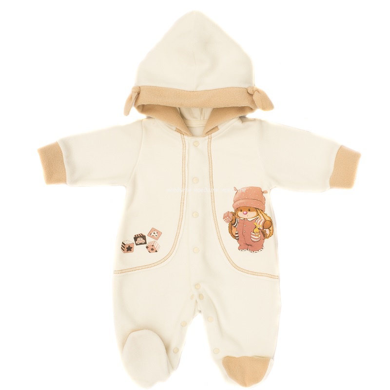 Комбинезон с капюшоном (декорирован ушками), с закрытыми ножками, рукавчики на манжетах, спереди и на ножках на кнопочках.