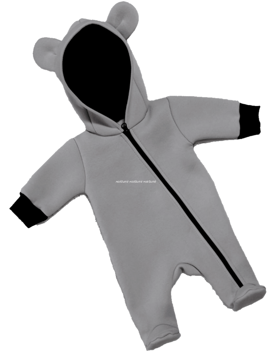 Комбинезон с закрытыми ножками, с капюшоном на подкладке, на молнии по всей длине и до конца одной ножки.